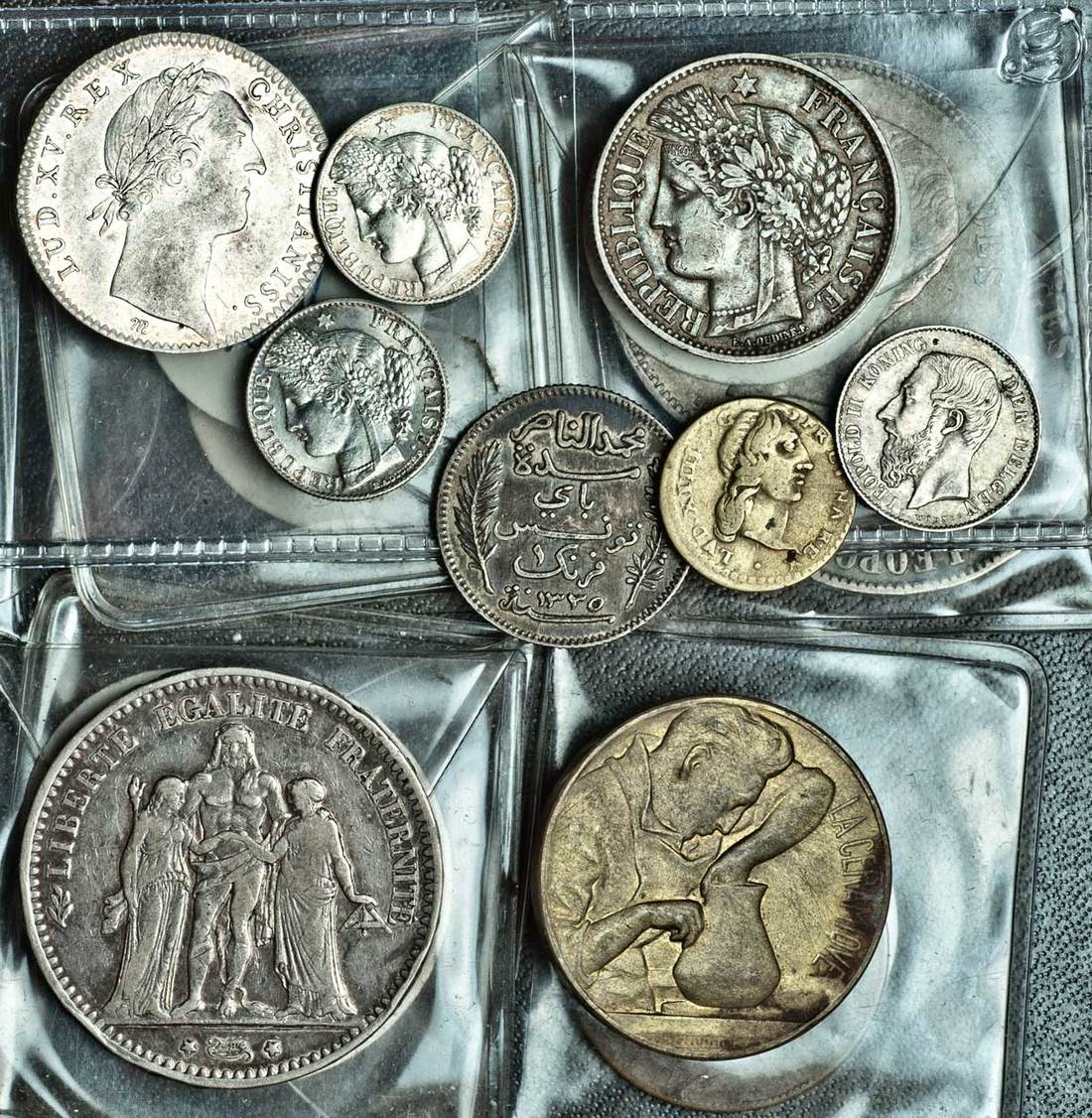 France, miscellaneous coins, tokens and medals (11), including 10-Francs, 1965, 5-Francs, 1874 A, 2-Francs, 1851 A, Franc, 1869 A, 50-Centimes (2), 1881 A, 1894 A, Louis XV, silver Jeton des Estats de Bretagne, 1756, Belgium, Leopold II, 5-Francs (2), 1871, 1873, 50-Centimes, 1886, and Tunisia, Franc, 1916, 50-Centimes, 1917, very fine and better (16)