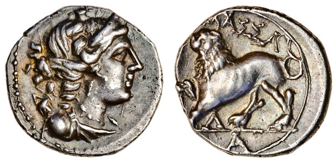 Gaul, Massilia (c.150-100 BC), AR Drachm, 2.56g, diademed and draped bust of Artemis right, quiver at shoulder, rev. maa, lion prowling left, below, a in exergue (DLT 1090 var.; cf. SNG Copenhagen 777), good very fine
