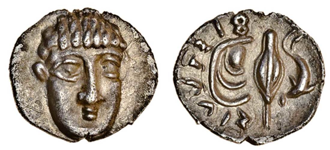 Campania, Phistelia (c.325-375 BC), AR Obol, 0.59g, male head facing, rev. mussel, barley-grain and dolphin, Oscan legend (SNG ANS 567; Hist. Num. 613), about extremely fine