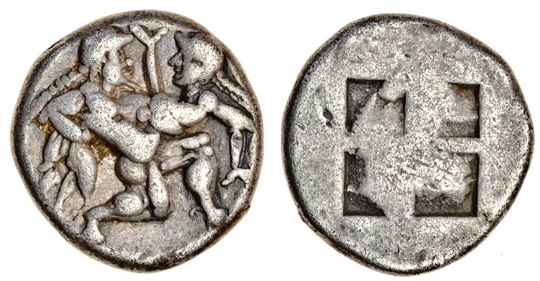 Thracian Islands, Thasos (c.500-463 BC), AR Stater, 9.42g, naked ithyphallic satyr carrying off protesting nymph right, rev. quadripartite incuse square (SNG Copenhagen 1008), almost very fine