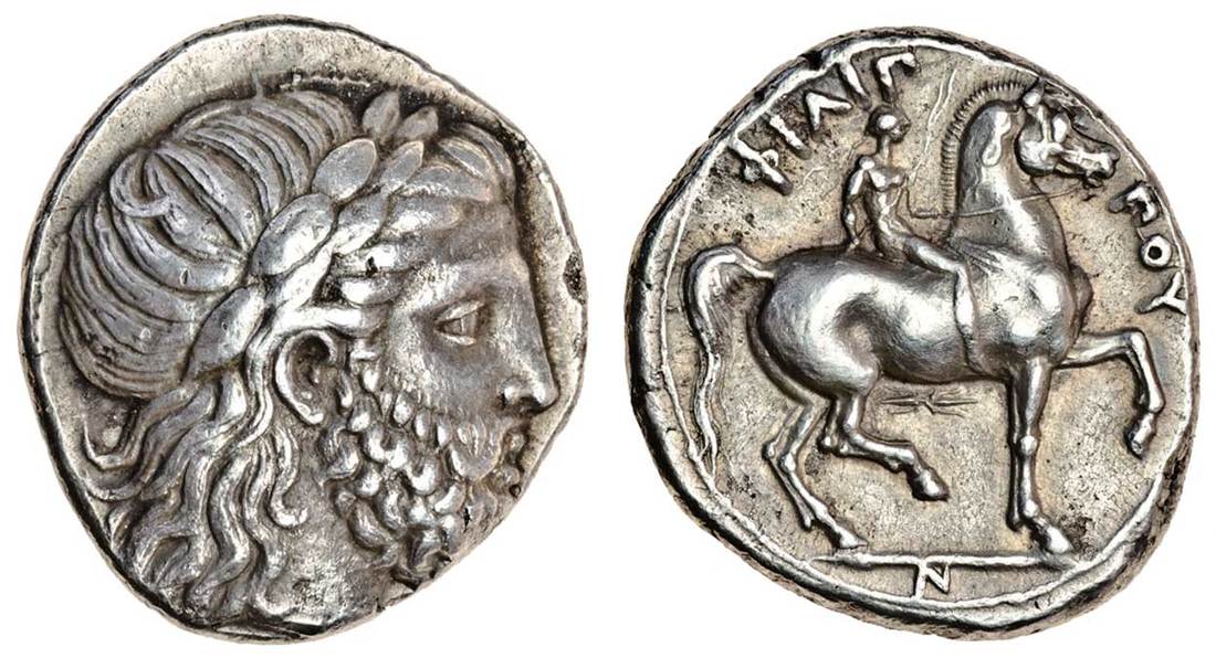 Kingdom of Macedon, Philip II (359-336 BC), AR Tetradrachm, 14.37g, Pella, c.342-336 BC, laureate head of Zeus right, rev. iioy, naked male on horseback right, carrying palm-branch, n in exergue (Le Rider 321-322, different dies; cf. SNG ANS 399), good very fine