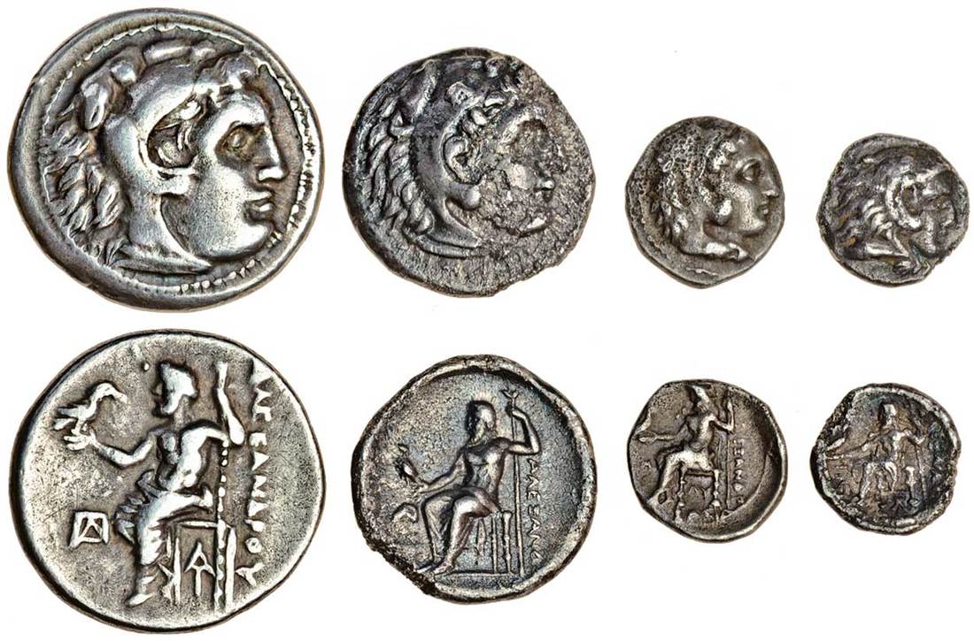 Kingdom of Macedon, Alexander III, the Great (336-323 BC), AR Drachm, 4.03g, Magnesia, head of young Herakles right, wearing lion's skin headdress, rev. Zeus enthroned left, holding eagle and sceptre (cf. Price 1959), good fine, a Hemidrachm, 2.00g, similar types, but ram's head left in left field (cf. Price 1919ff), apparently unrecorded in Price, some porosity, very fine, and two Obols, .51g and .66g, similar types, Ecbatana, letter and anchor in left field, monogram under throne (Price 3955), and Macedonia, y below throne, uncertain letter on left, almost very fine (4)