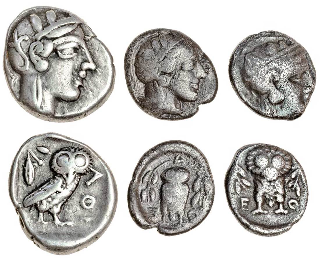 Attica, Athens (c.420's-400 BC), AR Drachm 4.26g, helmeted head of Athena right, rev. ae, owl standing right, head facing, olive spray and crescent behind (cf. Dewing 1602), a Triobol, 1.89g, helmeted head of Athena right, rev. ae, owl standing facing between olive-branches (Dewing 1603-1604), and another (mid 4th cent. BC), 2.04g, similar (Dewing 1626), fine to almost very fine (3)