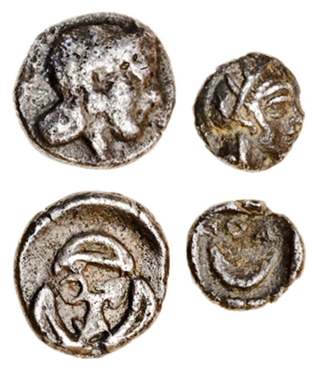 Attica, Athens (mid 4th cent. BC), AR Tritartemorion, 0.51g, helmeted head of Athena right, rev. ae within ring of three crescents (Dewing 1629), and a Tetartemorion, 0.16g, similar obverse, rev. a, crescent (Dewing 1633), good fine (2)