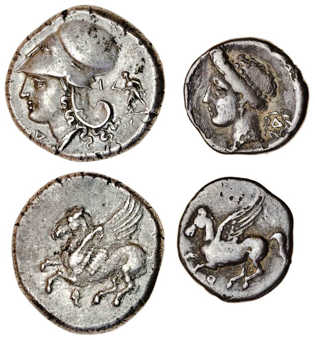 Corinth (c.375-300 BC), AR Stater, 8.53g, Pegasos flying left, koppa below, rev. head of Athena left, wearing Corinthian helmet, -i in field, Artemis holding torch behind (Ravel 1076; Pegasi 451), very fine, and a Drachm (c.350-300 BC), 2.13g, Pegasos flying left, koppa below, rev. head of Aphrodite left, within wreath behind (cf. BMC 297), toned, fine (2)
