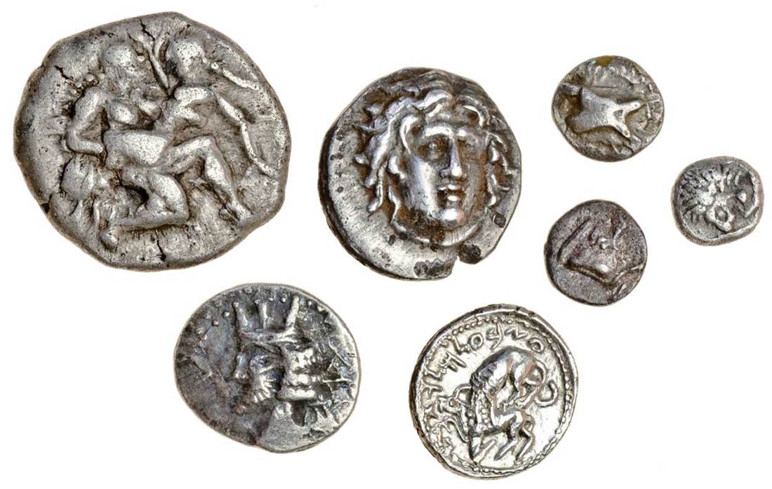 Caria, Euromos (c.400 BC), AR Tetartemorion, 0.23g, forepart of boar right, rev. head of Zeus right (SNG Finland 864), Uncertain Caria (5th cent. BC), AR Forty eighth stater, 0.26g, lion's head left, rev. bird standing left between two pellets (cf. SNG Finland 944), Rhodes (c.205-188 BC), AR Hemidrachm, 1.51g, head of Helios three-quarters facing right, rev. rose with bud, uncertain symbol on left (cf. SNG Finland 569ff), Uncertain Cilicia (4th cent BC?), AR Tetartemorion, 0.22g, astragalos, rev. astragalos within incuse square (SNG France - ), and Phoenicia, Byblos (c.350 BC), AR Sixteenth Stater, 0.80g, hoplites in galley left, hippocamp below, rev. lion attacking bull left (BMC 6), almost very fine to good very fine, together with a Drachm of Thasos (5th cent. BC), satyr carrying off struggling nymph, rev. quadripartite incuse square, good fine, and an Obol of the Kingdom of Persis, Ardeshir II (c.57 BC), head of king left, rev. attendant and fire-altar, good fine (7)