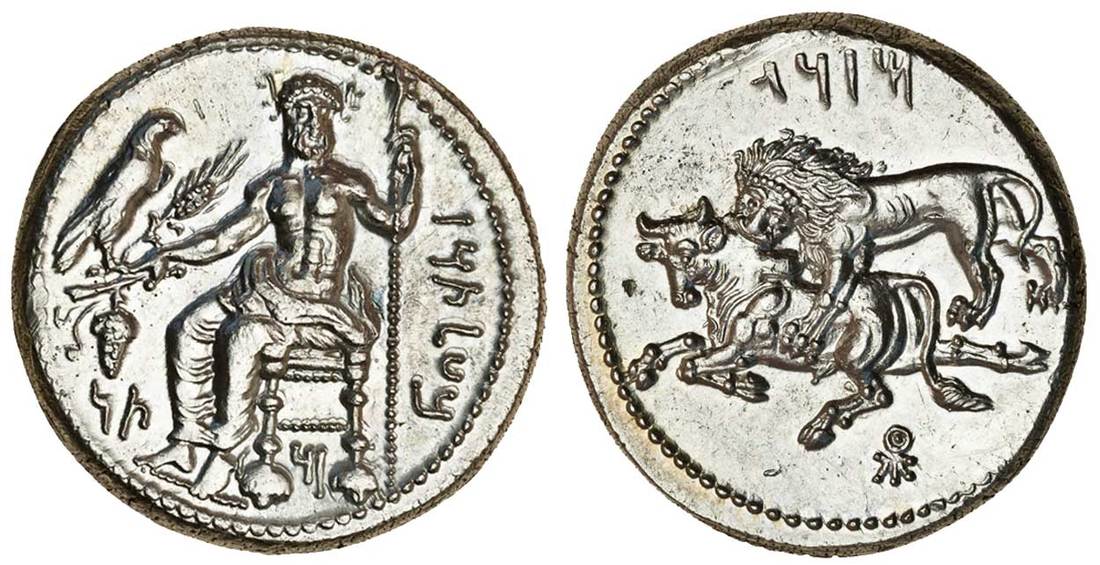 Cilicia, Tarsos, Satrap Mazaios (361-334 BC), AR Stater, 10.91g, Baaltars seated half left, head facing, holding vine-branch with bunch of grapes, and stalk of corn, on which stands eagle in right hand, holding sceptre in left hand, Aramaic on right, below and on left, rev. lion attacking bull left, Aramaic above, symbol below (SNG Levante 106; SNG CH 106 = this coin), brilliant, mint state, a superb example