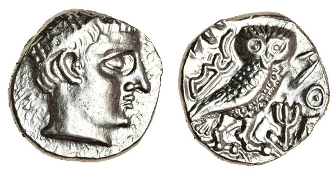 Southern Arabia, Qataban (pre 150 BC), AR Hemidrachm, 2.02g, male head right, wearing inscribed diadem, rev. ae, owl standing right, head facing, royal Qatabian monogram on right, monogram behind (Huth 357), good very fine, reverse extremely fine, a most interesting coin