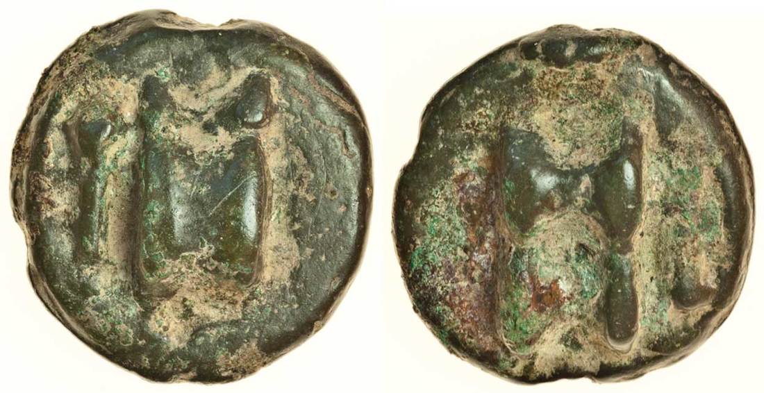 Roman Republic (c.235 BC), AE cast Uncia, 23.46g, knucklebone seen from outside, club below, rev. knucklebone seen from inside, club below (Vecchi 63; Hist. Num. 323; RRC 27/10), green patina, very fine