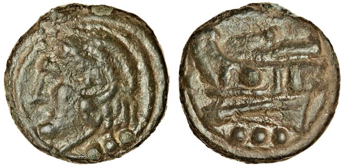 Roman Republic (c.217-215 BC), AE cast Semis, 56.74g, head of young Hercules left, wearing lion's skin headdress, three pellets below, rev. prow left, three pellets below (Vecchi 96; RRC 38/4), almost very fine