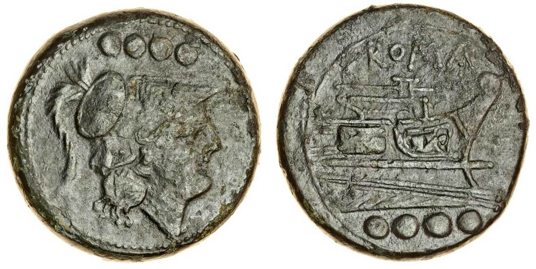 Roman Republic (c.217-215 BC), AE struck Triens, 27.49g, head of Minerva right, wearing crested Corinthian helmet, four pellets above, rev. prow right, roma above, four pellets below (RRC 41/7b; BMC 44), very fine