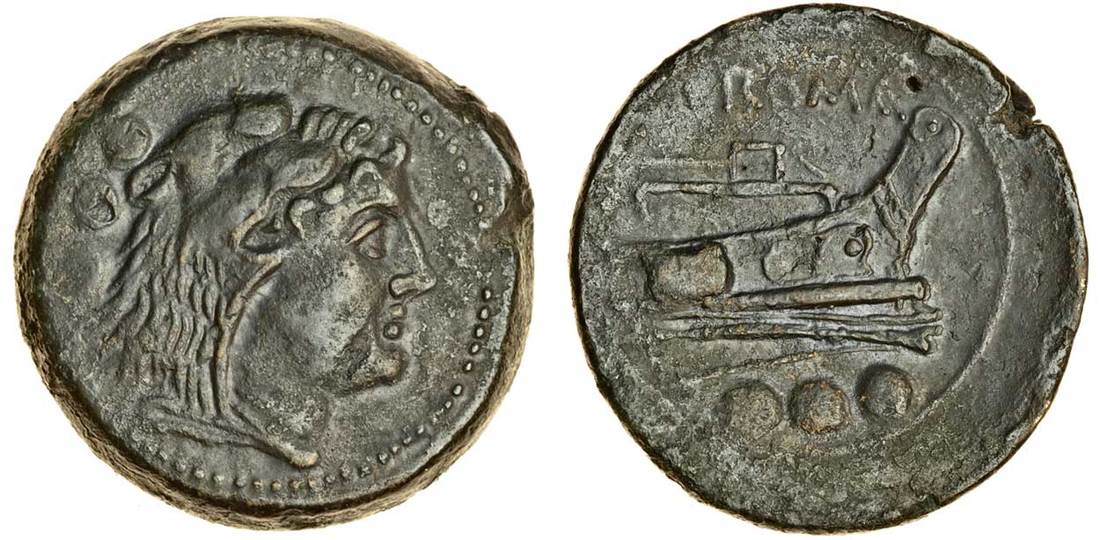 Roman Republic (215-212 BC), AE struck Quadrans, 18.75g, head of young Hercules right, wearing lion's skin, three pellets behind, rev. prow right, roma above, three pellets below (RRC 41/8b; BMC 53), good very fine
