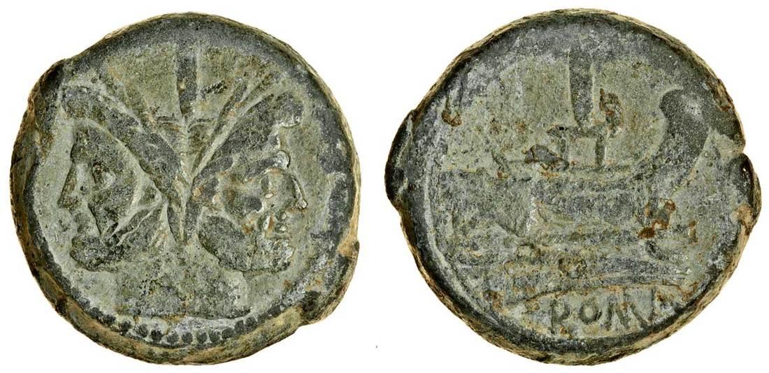 Roman Republic (after 211 BC), AE struck As, 39.99g, head of Janus, I above, rev. prow right, i above, roma below (RRC 56/2; BMC 217), olive-green patina, very fine