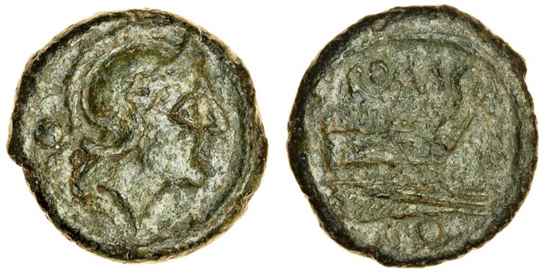 Roman Republic (208 BC), AE Uncia, 3.30g, Etruria (?), helmeted head of Roma right, pellet behind, rev. prow right, staff and roma above, pellet below (RRC 106/9 - "unique"), rare, almost very fine