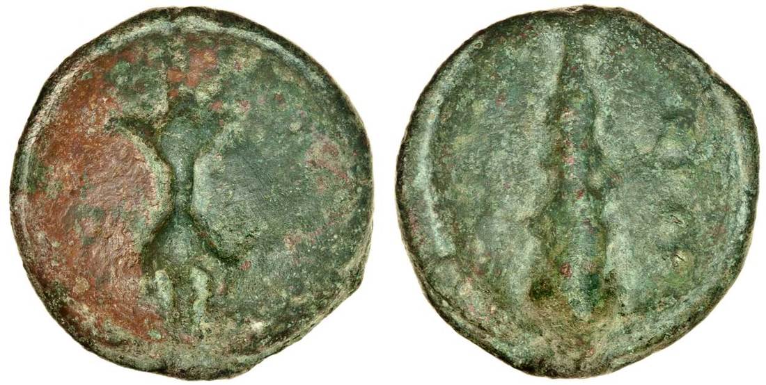 Apulia, Luceria (c.225-217 BC), AE cast Quatrunx, 123.69g, thunderbolt, rev. club, four pellets in field (Vecchi 339; Hist. Num. 671; Haeberlin pl. 70, 10), green patina with red areas on reverse, very fine
