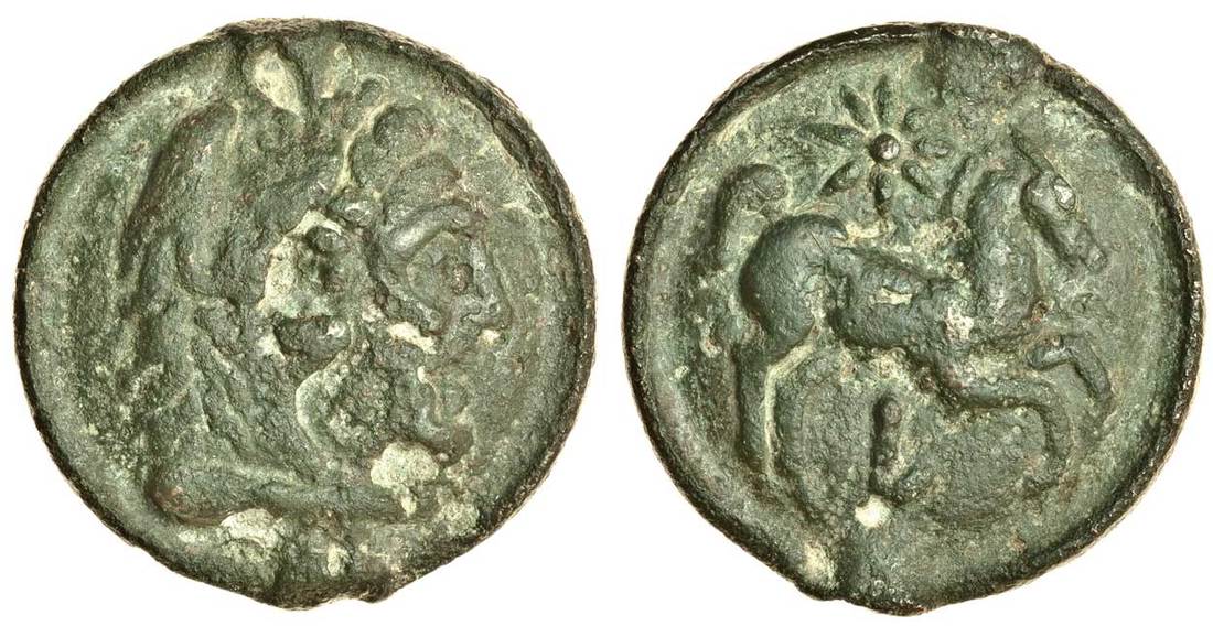 Apulia, Luceria (c.217-212 BC), AE Nummus, 85.82g, head of young Hercules right, wearing lion's skin, rev. horse prancing right, l below (Vecchi 344 = this coin; Hist. Num. 676; Haeberlin pl.71, 9-13)