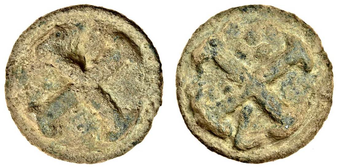 Apulia, Luceria (c.217-222 BC), AE cast lightweight Quincunx, 35.09g, four spokes of wheel, rev. as obverse, four pellets above, lL below (Vecchi 345; Hist. Num. 677a; Haeberlin pl.71, 14), green patina, good very fine