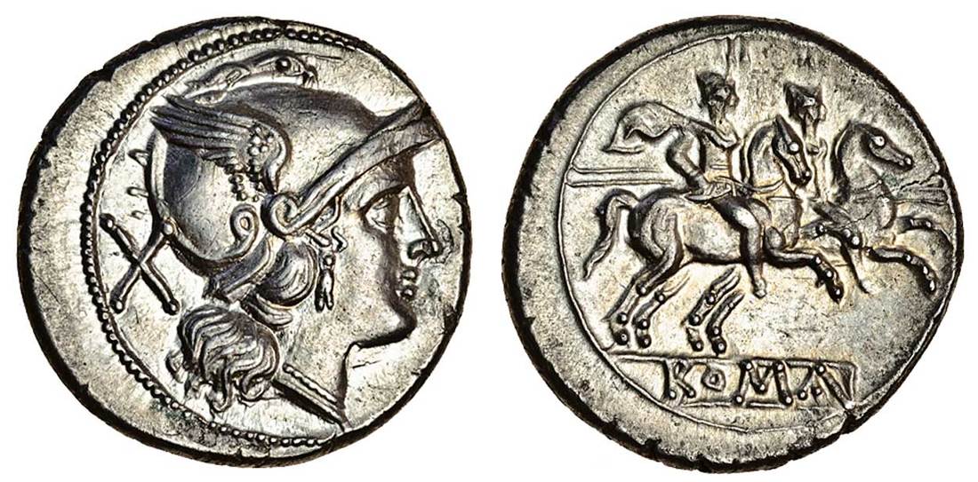 Anonymous (from 211 BC), AR Denarius, helmeted head of Roma right, x behind, rev. the Dioscuri on horseback right, roma in linear frame below (RRC 46/1), extremely fine