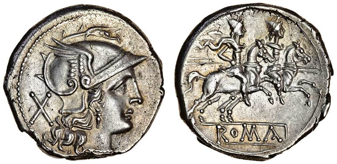 Anonymous (from 211 BC), AR Denarius, helmeted head of Roma right, x behind, rev. the Dioscuri on horseback right, roma in linear frame below (RRC 53/2), extremely fine