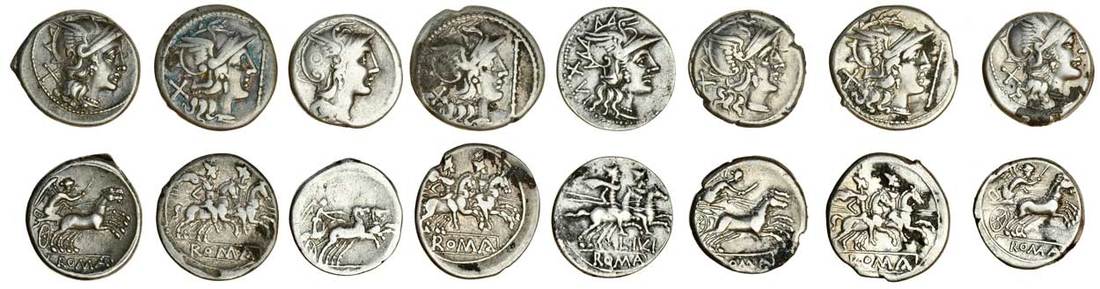 Anonymous (206-195 BC), AR Denarius, helmeted head of Roma right, x behind, staff before, rev. the Dioscuri on horseback right (RRC 112/2a), two others similar, Anonymous (157-156 BC), AR Denarius, helmeted head of Roma right, x behind, rev. Victory driving biga right (RRC 197/1), and three similar (one plated), L.Iulius Caesar (141 BC), AR Denarius, "Roma" head right, xvi behind, rev. the Dioscuri on horseback right (RRC 224/1), fine to almost very fine (8)