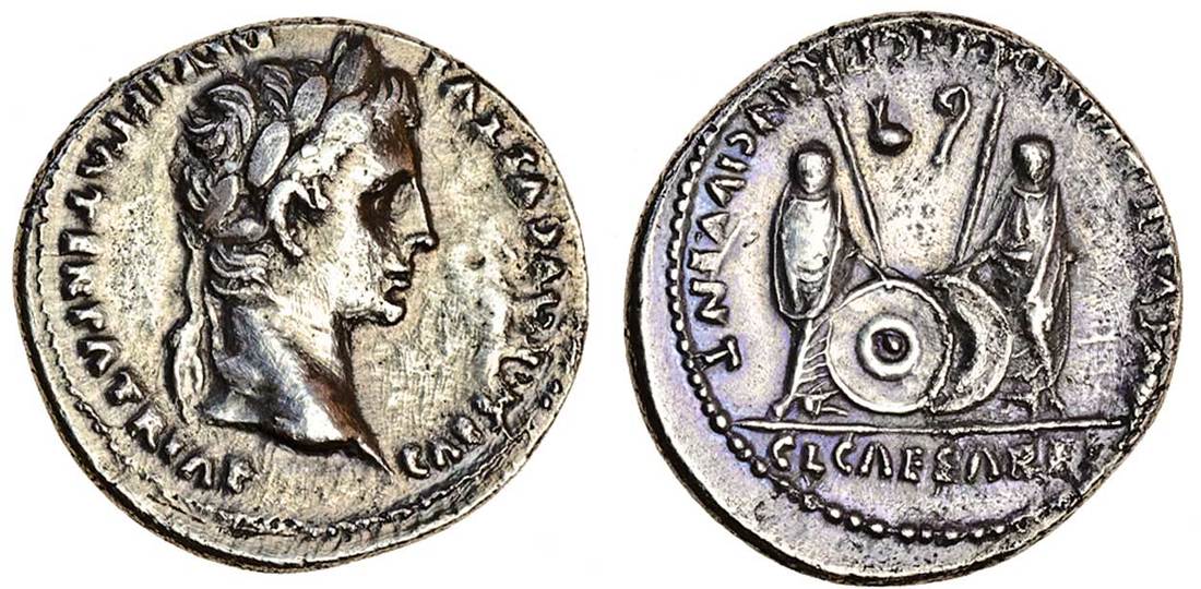 Augustus (27 BC-AD 14), AR Denarius, Lugdunum, 2 BC-AD 12, laureate head right, caesar avgvstvs divi f pater patriae, rev. avgvstvs f cos desig princ ivvent, Caius and Lucius Caesars standing facing, hands on shields, lituus and simpulum above, c l caesares in exergue (RIC 210; BMC 540; RSC 43c), unusually complete, smoothed, very fine