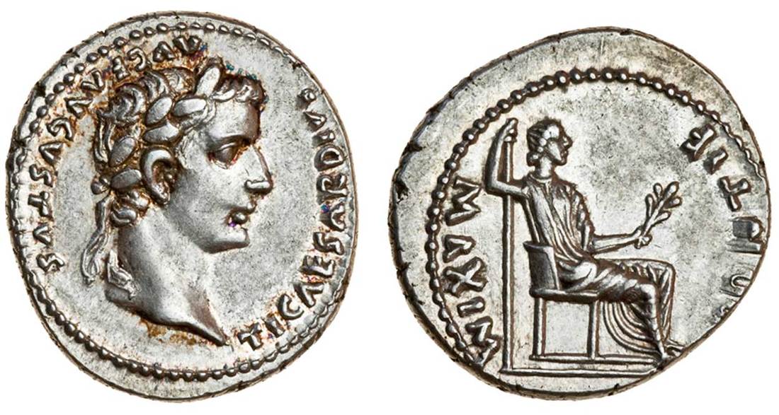 Tiberius (AD 14-37), AR Denarius, (or Tribute Penny), Lugdunum, post AD 16, laureate head right, ti caesar divi avg f avgvstvs, rev. pontif maxim, Livia as Pax seated right, holding sceptre and branch, the chair legs plain and over double line (BMC 34; RIC 26; RSC 16), a superb coin, lustrous, with some iridescence, extremely fine