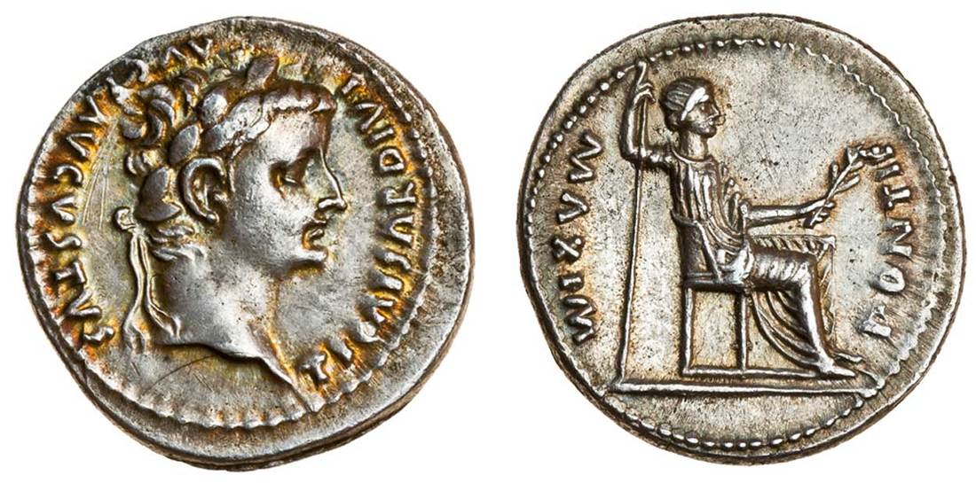 Tiberius(AD 14-37), AR Denarius, (or Tribute Penny), Lugdunum, post AD 16, laureate head right, ti caesar divi avg f avgvstvs, rev. pontif maxim, Livia as Pax seated right, holding sceptre and branch, the chair legs plain and over double line (BMC 34; RIC 26; RSC 16), a few light scratches behind portrait, almost extremely fine