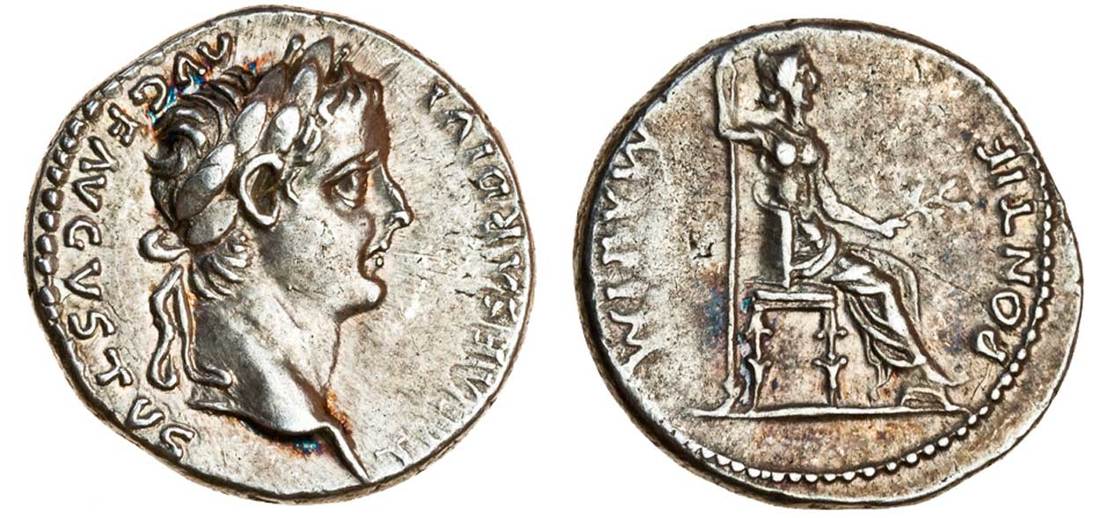 Tiberius (AD 14-37), AR Denarius, (or Tribute Penny), Lugdunum, post AD 16, laureate head right, ti caesar divi avg f avgvstvs, rev. pontif maxim, Livia as Pax seated right, feet on stool, holding inverted spear and branch, the chair legs ornate (BMC 45; RIC 28; RSC 16a), very fine