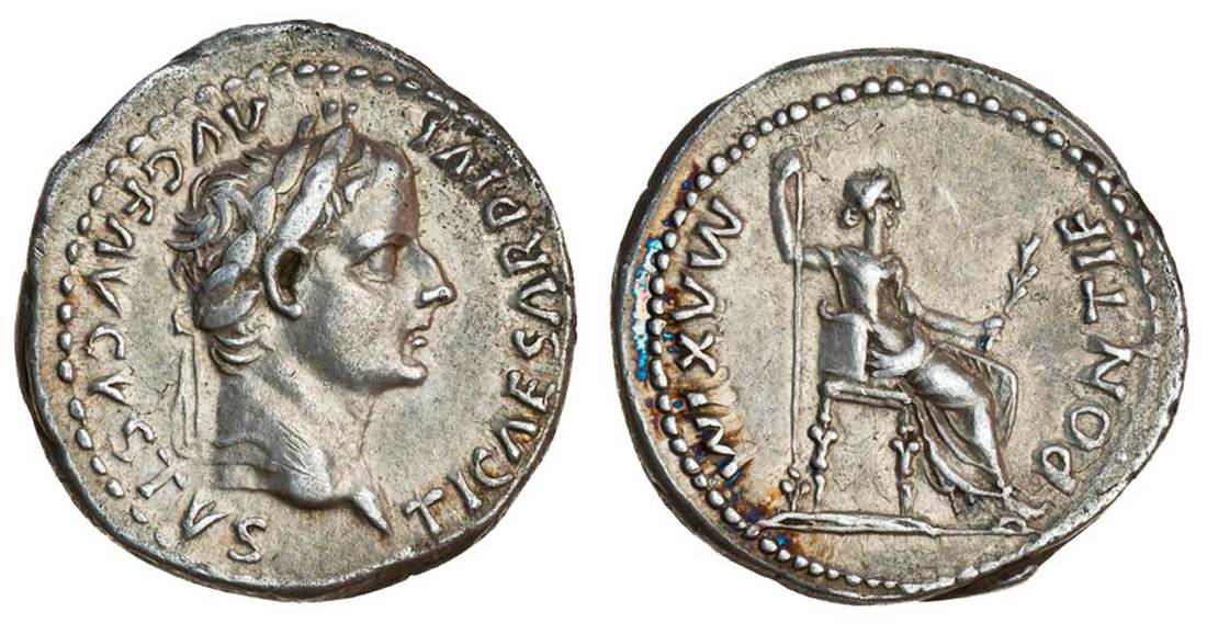 Tiberius (AD 14-37), AR Denarius, (or Tribute Penny), Lugdunum, post AD 16, laureate head right, ti caesar divi avg f avgvstvs, rev. pontif maxim, Livia as Pax seated right, feet on stool, holding inverted spear and branch, the chair legs ornate (BMC 45; RIC 28; RSC 16a), good very fine