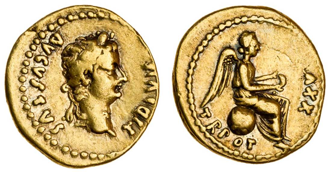 Tiberius (AD 14-37), AV Quinarius, 3.86g, 23-24, Lugdunum, laureate head right, ti divi f avgvstvs, rev. tr pot xxv, Victory seated right on globe, holding wreath (BMC 17; RIC 9), about very fine, rare