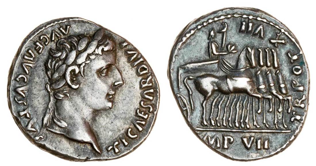 Tiberius (AD 14-37), AR Denarius, Lugdunum, 15-16, laureate head right, ti caesar divi avg f avgvstvs, rev. tr pot xvii, Tiberius standing in triumphal quadriga right, holding branch and eagle-tipped sceptre, imp vii in exergue (BMC 8; RIC 4; RSC 48), toned, about extremely fine