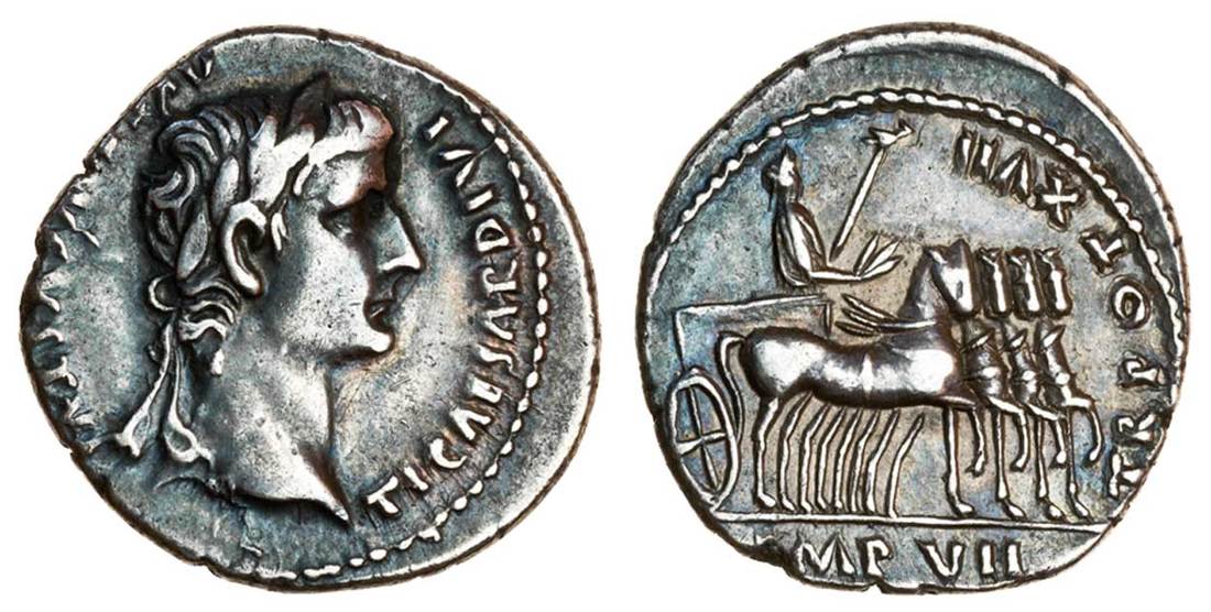Tiberius (AD 14-37), AR Denarius, Lugdunum, 15-16, laureate head right, ti caesar divi avg f avgvstvs, rev. tr pot xvii, Tiberius standing in triumphal quadriga right, holding branch and eagle-tipped sceptre, imp vii in exergue (BMC 8; RIC 4; RSC 48), toned, very fine