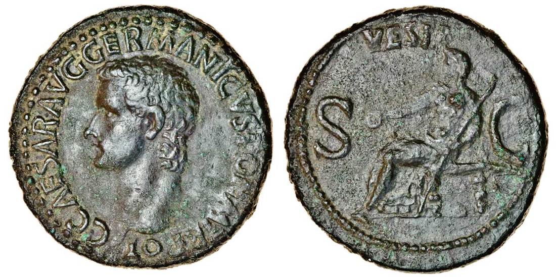 Caligula (AD 37-41), AE As, Rome, 37-38, bare head left, rev. vesta sc, Vesta seated left, holding patera and sceptre (RIC 38; BMC 46), good very fine, reverse very fine