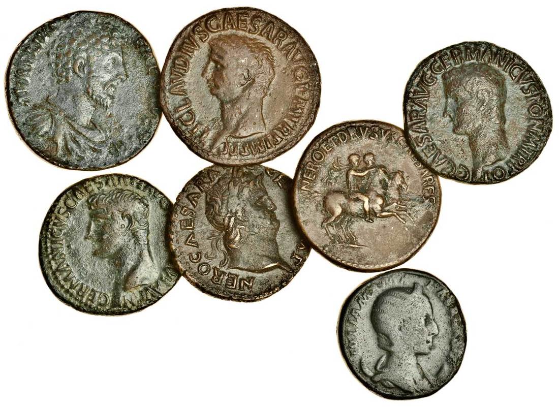Caligula (AD 37-41), AE As, Rome, 37-38, bare head left, rev. vesta sc, Vesta seated left, holding patera and sceptre (RIC 38; BMC 46), good fine, verdigris on reverse, Germanicus, AE As, 40-41, bare head left, legend around large S C (RIC 50; BMC 74), good fine, Nero and Drusus Caesars, AE Dupondius, struck under their brother Caligula, 40-41, Nero and Drusus on horseback right, nero et drvsvscaesares, rev. legend around large sc (RIC 49; BMC 70), almost very fine, reverse good fine, Claudius (AD 41-54), AE As, bare head left, rev. sc, Minerva advancing right, holding spear and shield (RIC 116; BMC 206), about very fine, Nero (AD 54-68), AE As, laureate head right, rev. temple of Janus with closed doors (RIC 300; BMC 225), very fine, together with a Sestertius of Marcus Aurellius, bare-headed, draped and cuirassed bust right, rev.Virtus standing right, holding parazonium and sceptre (C. 748), almost very fine, and a Dupondius of Julia Mamaea, fair (7)