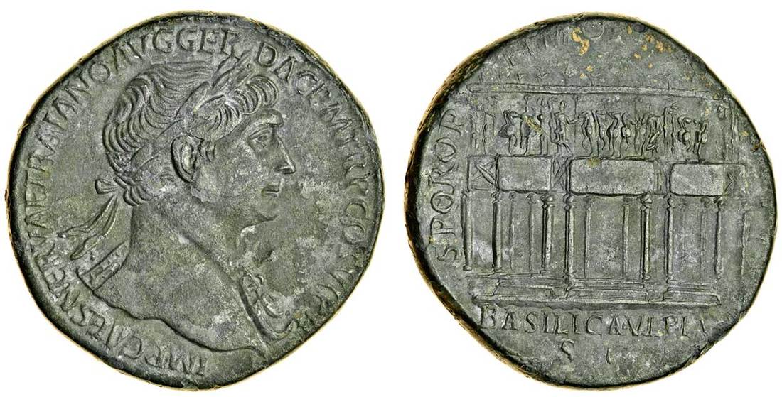Trajan (AD 98-117), AE Sestertius, Rome, c.112-114, laureate bust right with aegis on right shoulder, drapery on left, imp caes nerva traiano avg ger dac pm trp cos vi pp, rev. spqr optimo p[rinci]pi basilica vlpia sc, façade of the Basilica Ulpia - large rectangular building with three projecting epistyla, the central one surmounted by facing quadriga between two statues, the separate flanking epistyla surmounted by horsemen, all on two-stepped podium (cf. RIC 617 and 618; cf. BMC 982 and 983; cf. Woytek, Die Reichsprägung Des Kaisers Traianus, 464c), absolutely natural, and intact, pale green patina, virtually extremely fine and very rare