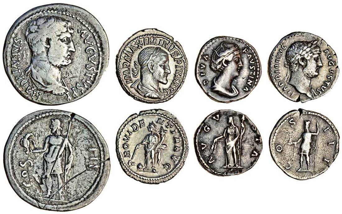 Hadrian (AD 117-138), AR Cistophorus, Aezani, bare-headed, draped and cuirassed bust right, rev. cos iii, Jupiter standing left, holdingeagle and sceptre (Metcalf, type 49; RIC 497 var.), two scratches on reverse, good fine, together with a Denarius, laureate head right, rev. cos iii, Roma standing left (RIC 161; RSC 349), good fine, a Denarius of Faustina Snr, draped bust right, rev. avgvsta, Ceres standing left (RIC 360; RSC 78), very fine, and a Denarius of Maximinus I, laureate, draped and cuirassed bust right, rev. providentia avg, Providentia standing left, holding wand over globe, and cornucopia (RIC 13; RSC 78), very fine (4)