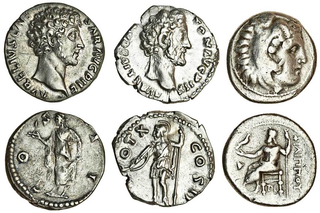 M. Aurelius (AD 161-180), AR Denarius, as Caesar, bare head right, rev. Virtus standing left, holding parazonium and spear (RIC 468; RSC 703), about very fine, and another, obverse similar, rev. Spes walking left, holding flower (RIC 431; RSC 103), light scratches behind head, good very fine, reverse very fine, together with Macedon, Philip III (323-317 BC), AR Drachm, Sardes, head of young Herakles right in lion's skin, rev. Zeus enthroned left, holding eagle and a sceptre, rose (?) on left, TI below throne (cf. Price P102ff), good fine (3)