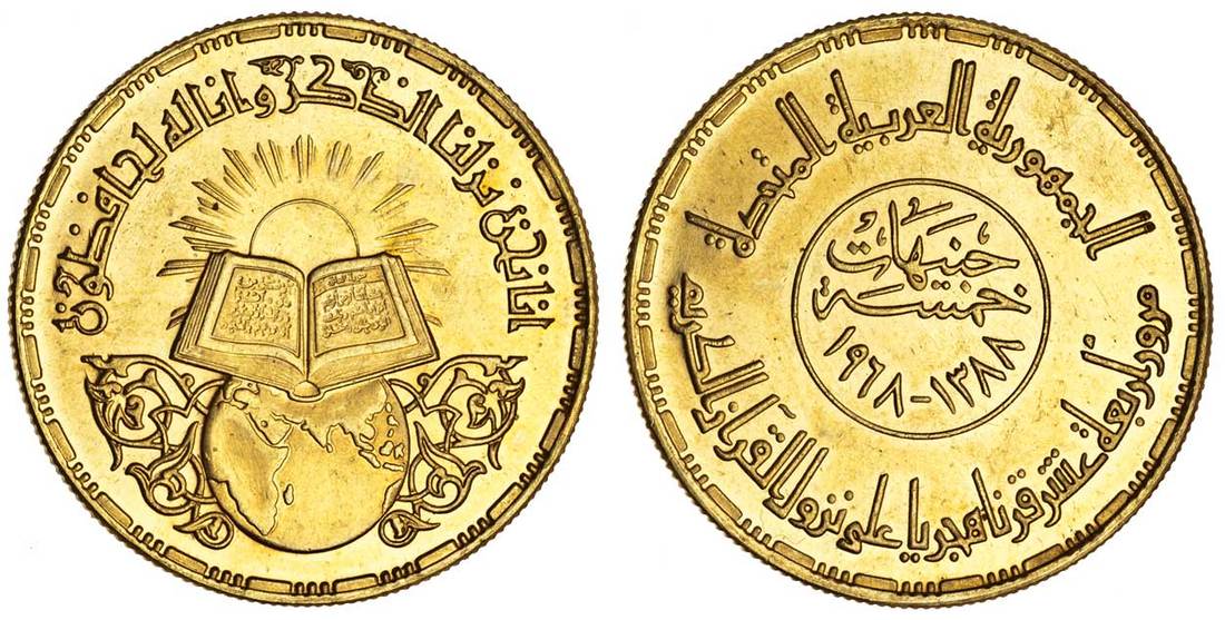 Egypt, United Arab Republic (1958-1971), AV 5-Pounds, 1968 / AH1388, commemorating the 1400th Anniversary of the Koran, radiant sun above Koran set on globe, rev. ornamental Kufic legend (KM.416; Fr.48), attractive proof-like finish, about uncirculated