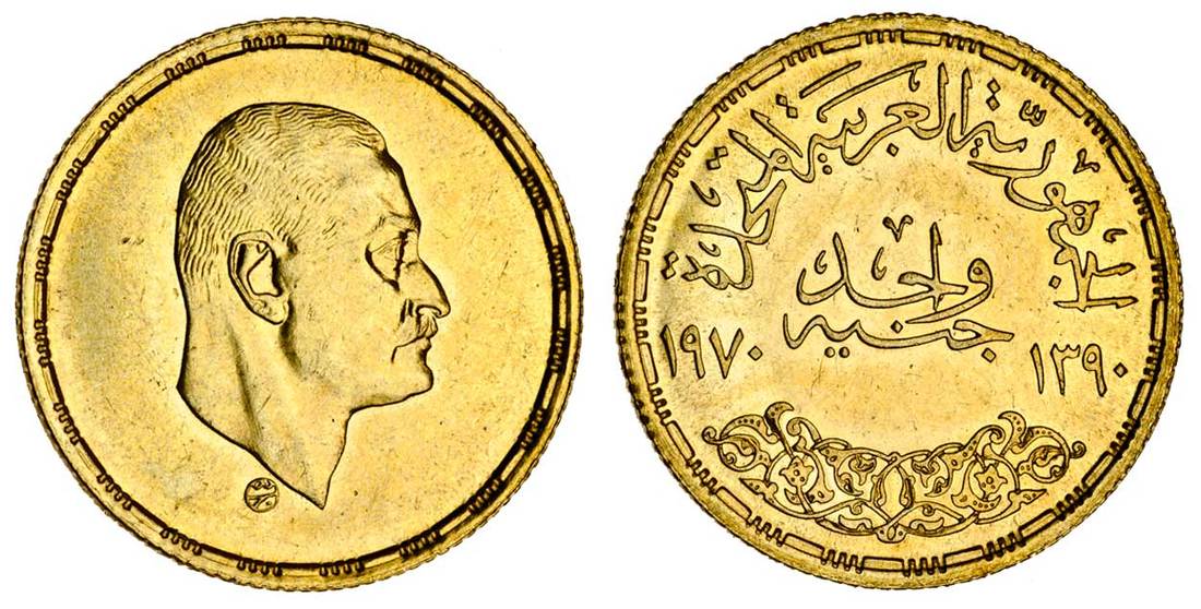 Egypt, United Arab Republic (1958-1971), AV Pound, 1970 / AH1390, commemorating President Nasser, head of Nasser right, rev. ornamental legend (KM.426; Fr.50), about uncirculated