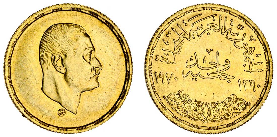 Egypt, United Arab Republic (1958-1971), AV Pound, 1970 / AH1390, commemorating President Nasser, head of Nasser right, rev. ornamental legend (KM.426; Fr.50), good extremely fine