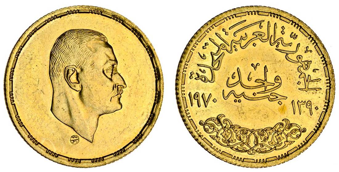 Egypt, United Arab Republic (1958-1971), AV Pound, 1970 / AH1390, commemorating President Nasser, head of Nasser right, rev. ornamental legend (KM.426; Fr.50), extremely fine