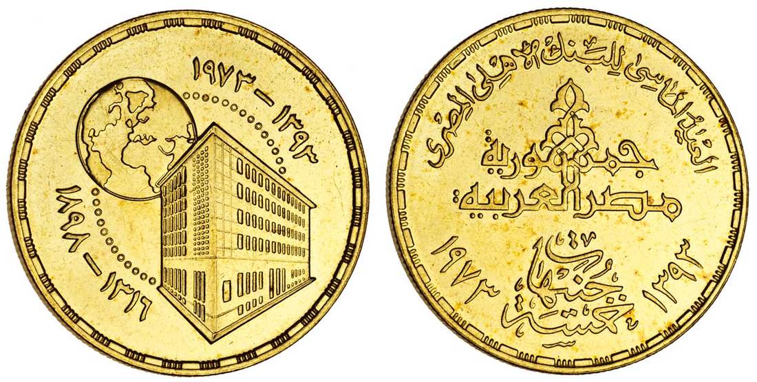 Egypt, Arab Republic (1971- ), AV 5-Pounds, 1973 / AH1393 (1973), 75th Anniversay of the National Bank of Egypt, bank building with globe behind, rev. Arabic legend with Kufic calligraphy (KM.441; Fr.51), about uncirculated