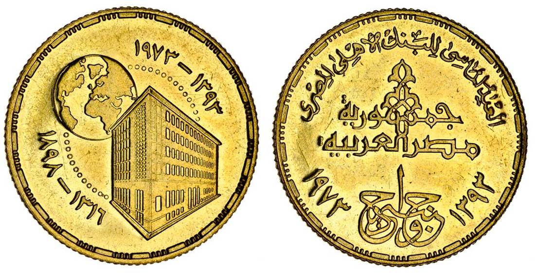 Egypt, Arab Republic (1971- ), AV Pound, 1973 / AH1393, 75th Anniversary of the National Bank of Egypt, bank building with globe behind, rev. Arabic legend with Kufic calligraphy (KM.440; Fr.52), extremely fine