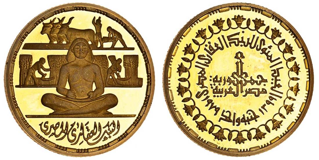 Egypt, Arab Republic (1971-), proof AV Pound, 1979 / AH1399, 100th Anniversary, Bank of Land Reform, ancient Egyptian figure seated with farming scene behind, rev. ornamental Kufic legend (KM.492; Fr.62), some fields slightly clouded, about uncirculated