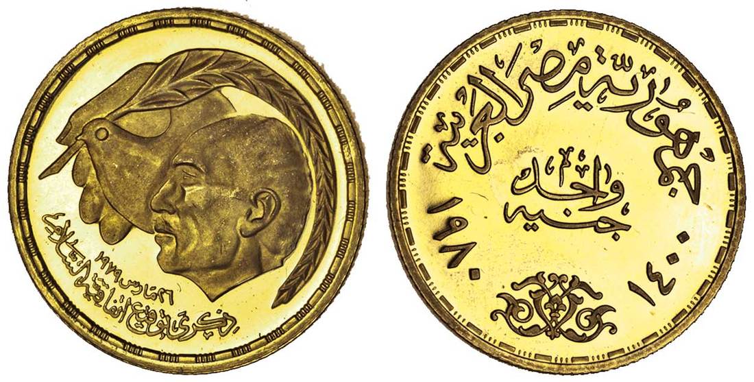 Egypt, Arab Republic (1971-), proof AV Pound, 1980 / AH1400, Egyptian-Israeli Peace Treaty, head of Anwar Sadat left with dove of peace holding a quill behind, rev. ornamental Arabic legend (KM.509; Fr.67), uncirculated, about as struck