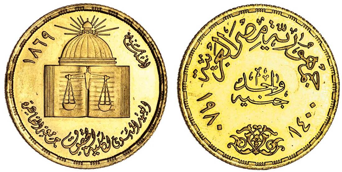 Egypt, Arab Republic (1971-), proof AV Pound, 1980 / AH1400, celebrating Cairo University of Law, domed building with book and scales of justice before, rev. ornamental legend (KM.516; Fr.70), uncirculated