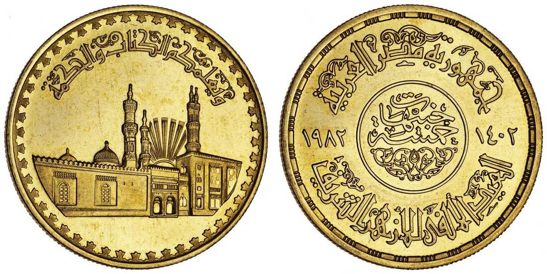 Egypt, Arab Republic (1971-), proof AV 5-Pounds, 1982 / AH1402, commemorating the 1000th year of the Al-Azhar Mosque, mosque with sun rising behind, rev. legend in ornamental Kufic script (KM.546; Fr.80), uncirculated