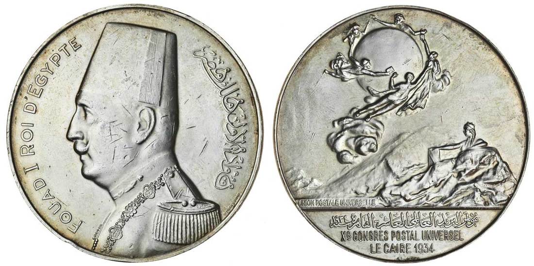 Egypt, Fuad I (1922-36), silver Medal by P.Minassian, commemorating the 10th International Postal Congress, Cairo, 1934, 70mm, bust of king left, rev. figures encircling a globe, above female figure reclining on a rock, some surface nicks and an edge knock at 7 o/clock, otherwise extremely fine