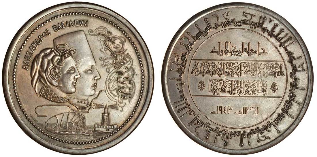Egypt, Farouk (1936-52), bronze medal by T. Bichay, commemorating the opening of the University of Alexandria, 1942 / AH1361, 75.5mm, conjoined busts of Alexander the Great and king Farouk above the lighthouse of Alexandria and a dhow, rev. legend in ornamental Kufic script, extremely fine