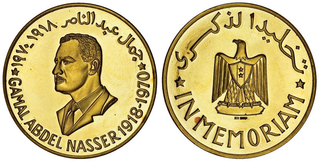 Egypt, proof AV Medal (2½-Pounds), 15.76g, 1970, commemorating the life of President Nasser, 1918-70, bust of Nasser left, rev. Egyptian eagle, uncirculated, with frosted effigy and mirror-like fields